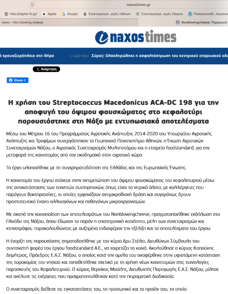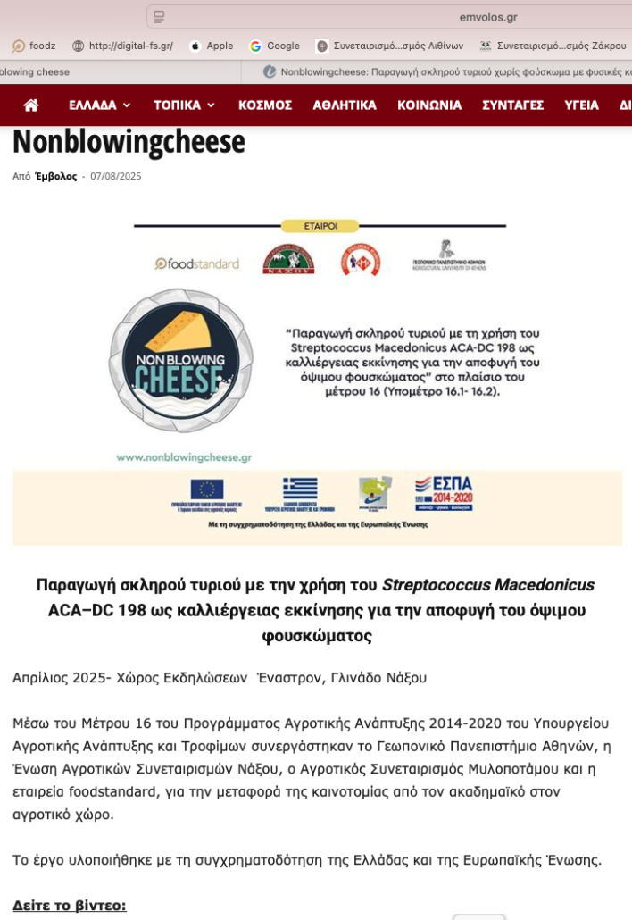 Μια ιδιαίτερα όμορφη βραδιά είχαν τη χαρά να απολαύσουν, την Πέμπτη 8 Μαΐου 2025, οι παρευρισκόμενοι της εκδήλωσης – παρουσίασης των αποτελεσμάτων του έργου Nonblowingcheese με τίτλο ¨Παραγωγή σκληρού τυριού με τη χρήση του Streptococcus Macedonicus ACA- DC 198 ως καλλιέργειας εκκίνησης για την αποφυγή του όψιμου φουσκώματος¨.
